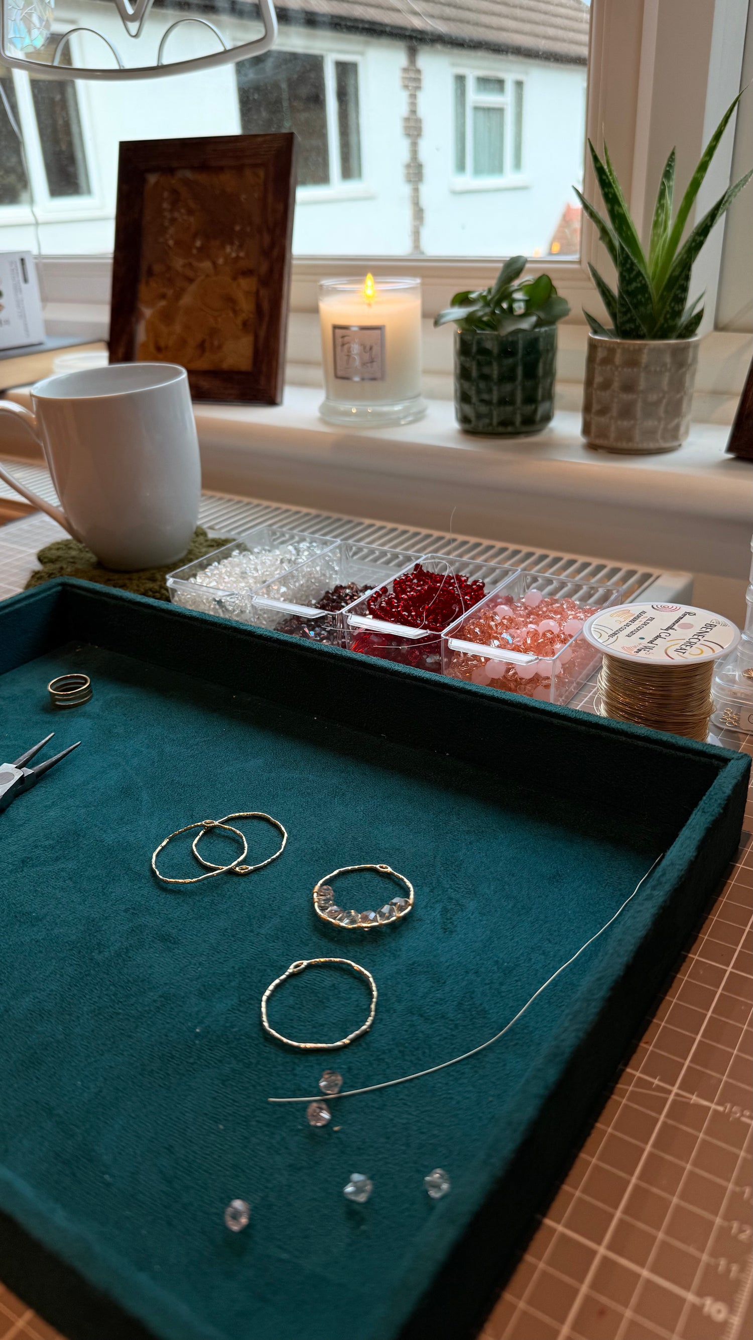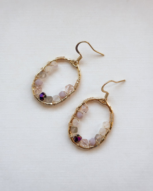 Our wire-weaving technique builds architectural scaffold frames around crystal glass beads and freshwater pearls, using 24k gold-plated stainless steel and recycled brass. Each piece woven by hand, one structure at a time.