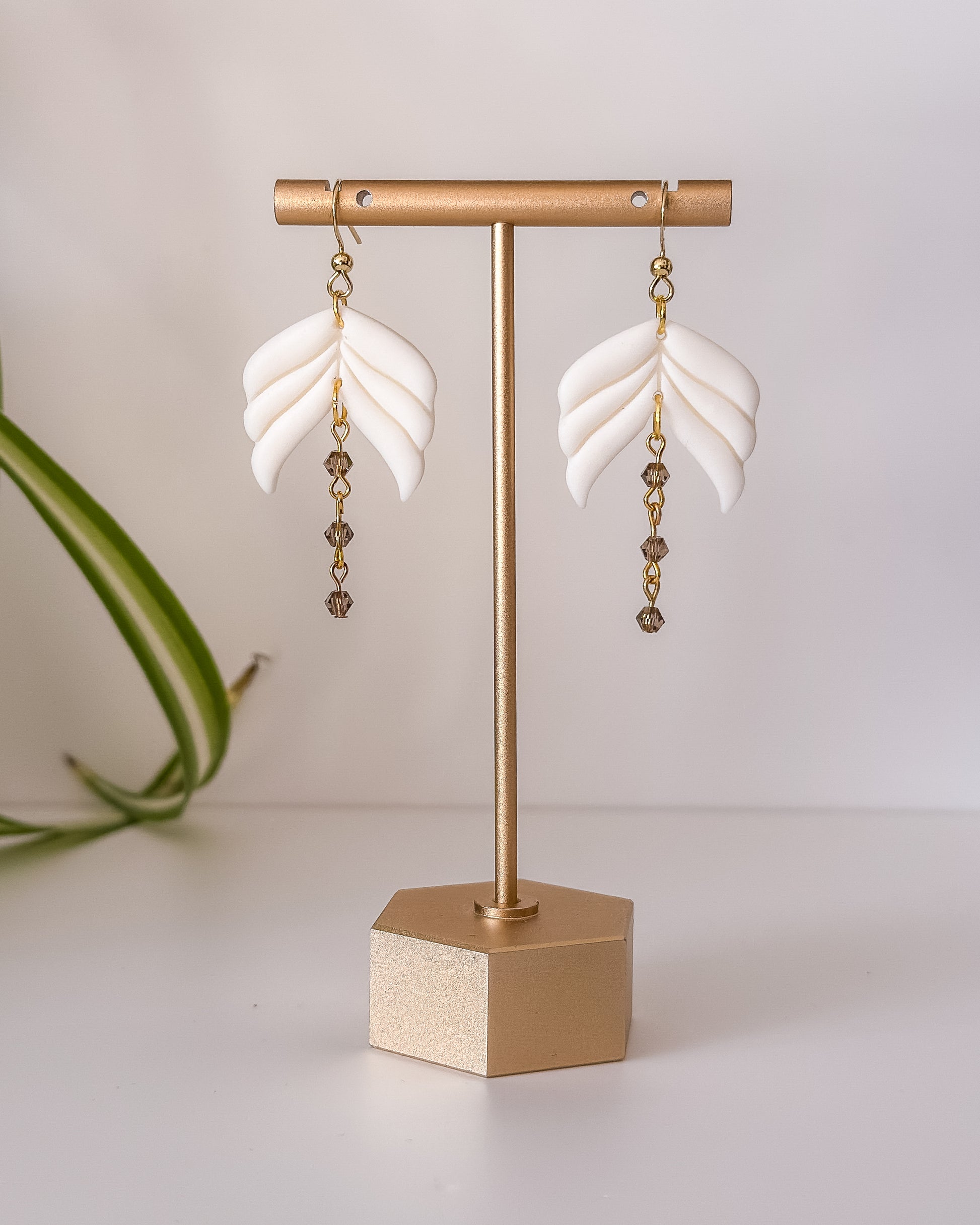 Delicate arches crafted from lightweight polymer clay form the foundation of these refined earrings, enhanced with lustrous glass accents that catch the light beautifully. Perfect for bridal occasions or everyday elegance, their featherweight construction ensures all-day comfort without compromising on style. The sophisticated arch design adds architectural interest to any ensemble, while the combination of materials creates an understated luxury. Ideal for those seeking jewellery that balances contemporary design with timeless appeal.