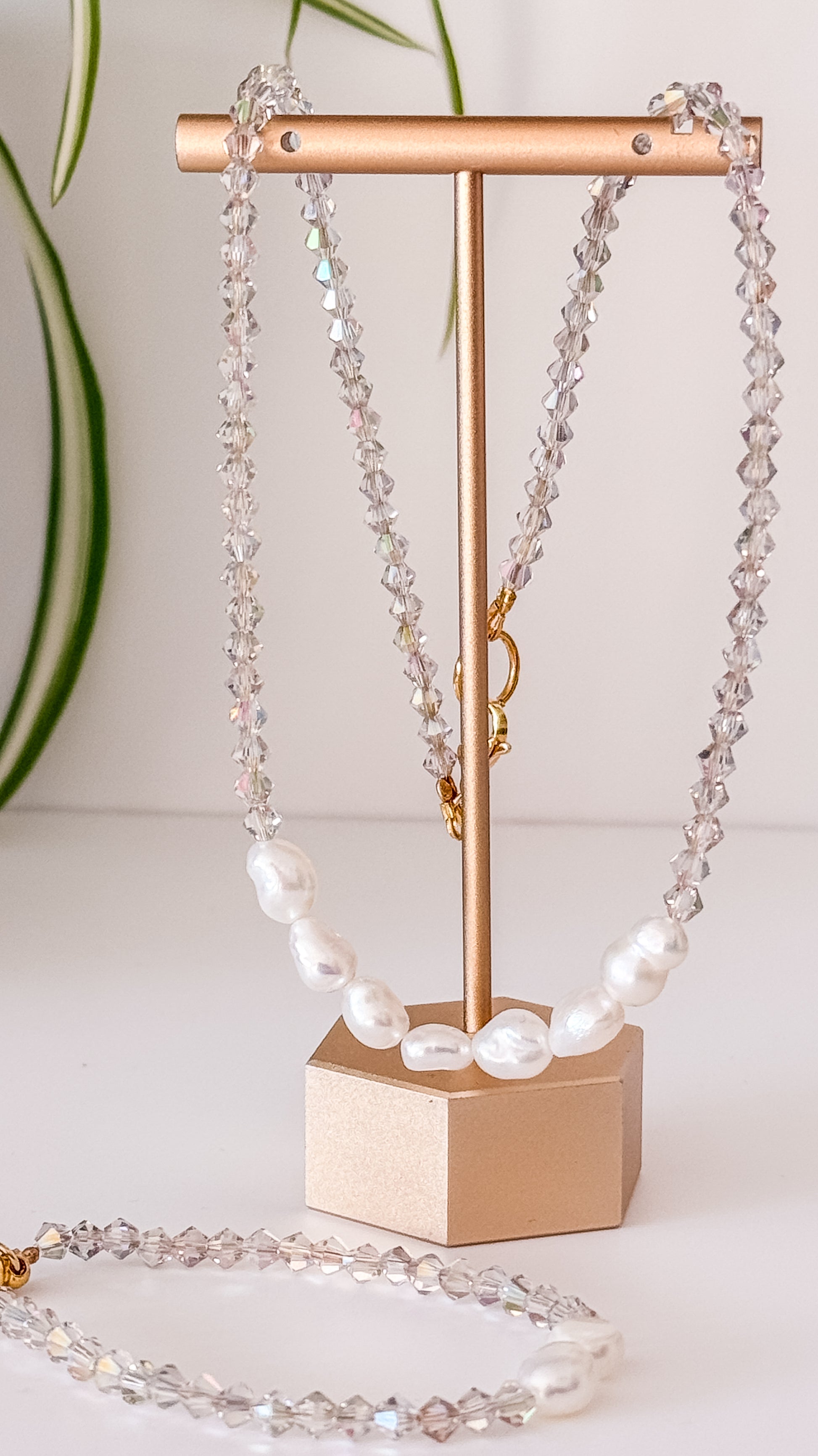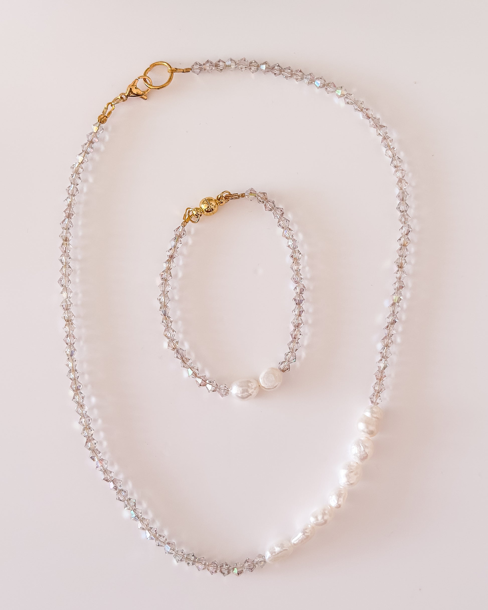 Elevate your bridal ensemble with this luxurious two-piece set, featuring a coordinated necklace and bracelet crafted from 24k gold-plated sterling steel. Delicate glass accents catch the light beautifully, creating an ethereal shimmer that complements any wedding gown. The precious metal plating ensures lasting brilliance, while the refined design offers timeless elegance without overwhelming your look. Perfect for brides seeking understated glamour and jewellery that transitions seamlessly from ceremony to celebration.