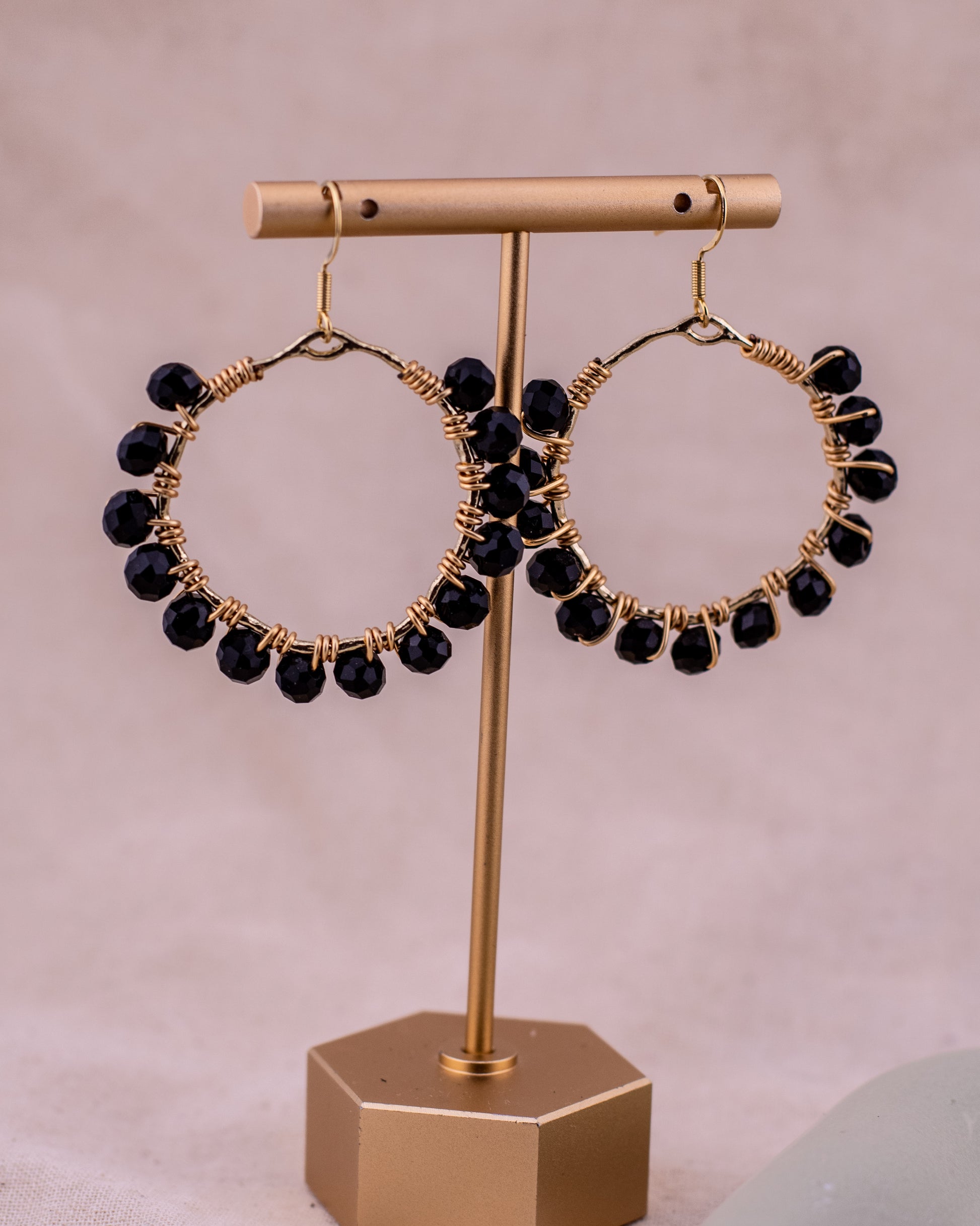 Make a dark and dazzling statement. Our Obsidian Orbit Hoops are designed for the bold, featuring oversized, textured gold bezels hand-wrapped with a striking crown of jet-black glass beads. The multifaceted glass catches the light with every turn, creating a sophisticated shimmer that transitions effortlessly from a gallery opening to a midnight dinner.