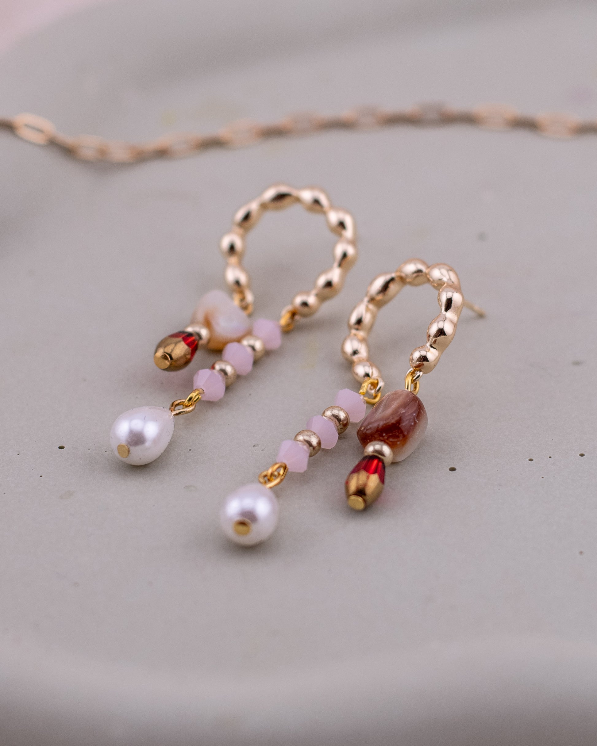 From these radiant hoops hang two distinct tiers of elegance: one strand featuring faceted rose-pink glass crystals and a luminous teardrop freshwater pearl, and a shorter companion strand showcasing earth-toned glass stones and a vibrant ruby-red accent bead.